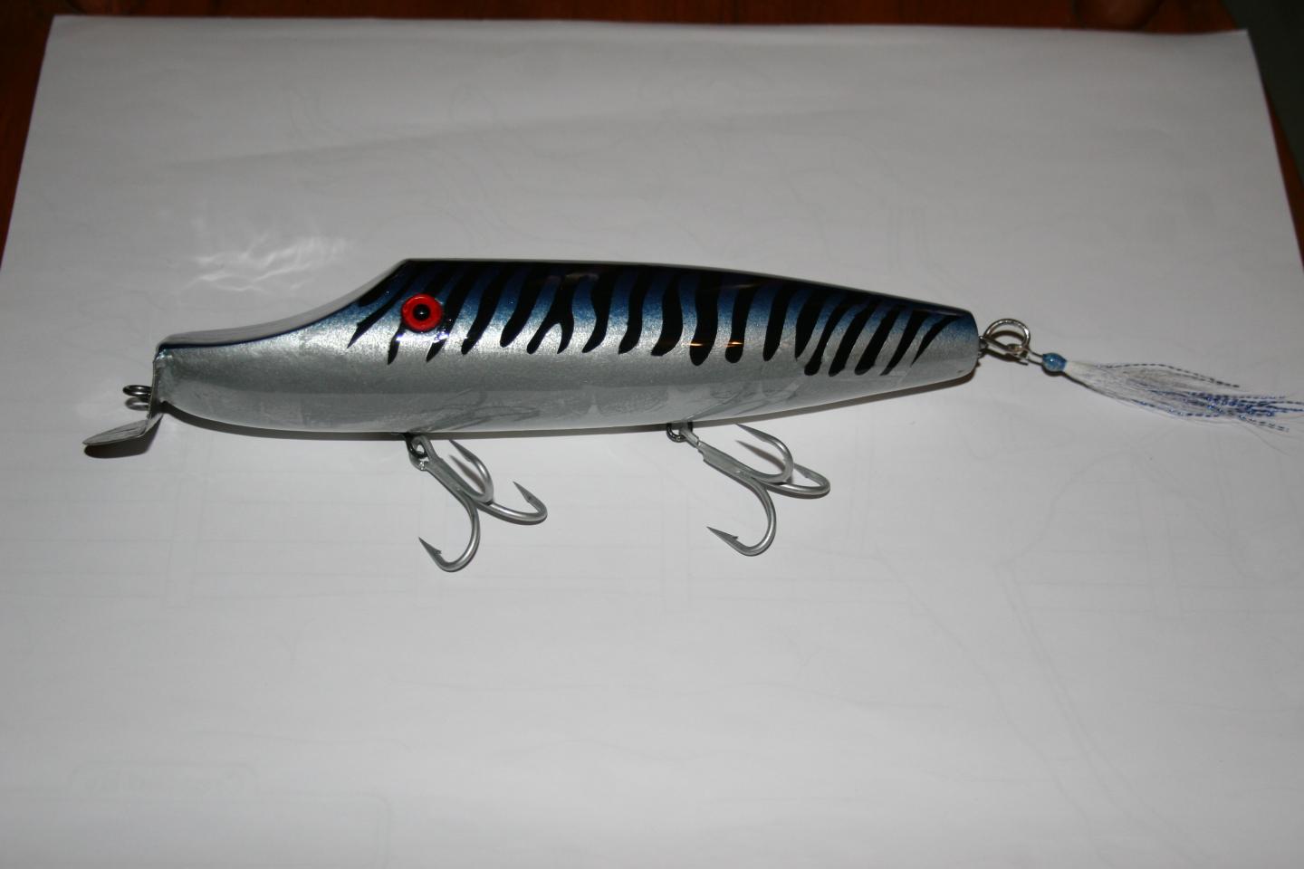A squid darter, the paint work was inspired by a flaptail squid, Greek had given me, lots of time into this one, redesigned my darter & am happy with the darting motion. 5 1/2" Nike, played with them a bit and although the original was unweighted I found them to swim better with a bit of lead in them. Handcarves are my new obsession! The yellow one is a 7" redfin copy, the middle one is an 8", I wanted a slightly larger plug, the 3rd one is 11" around 4 oz , the mackerel paint was done by Jmac, they look lifelike! |