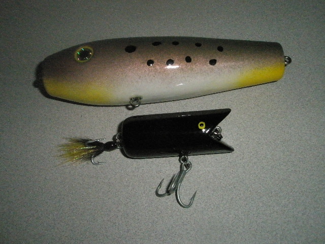 The Greek, for talking me into taking back the lathe I gave him.:p I figured I'd start out with some plugs I like to fish that are easy so I made some spooks. Made out of pine about 6-1/4" long. No scale so I do not know how much they weigh, maybe 3ozs.