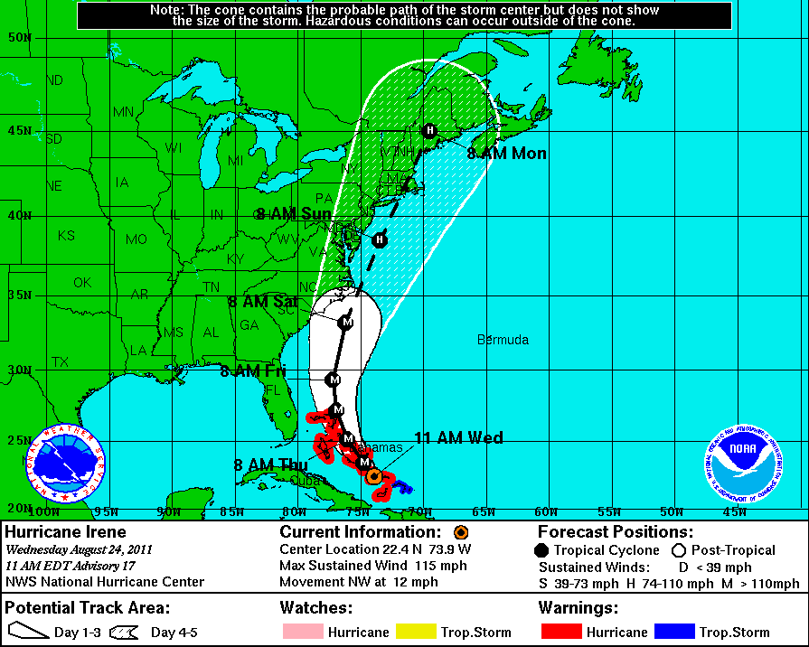 Latest computer predictions: AM hurricane guidance has Irene just south of N.Carolina Sat AM as Cat 2/3 storm, ready to run the coast. Long ways out but interesting track up the east coast, especially if it moves slightly farther east.