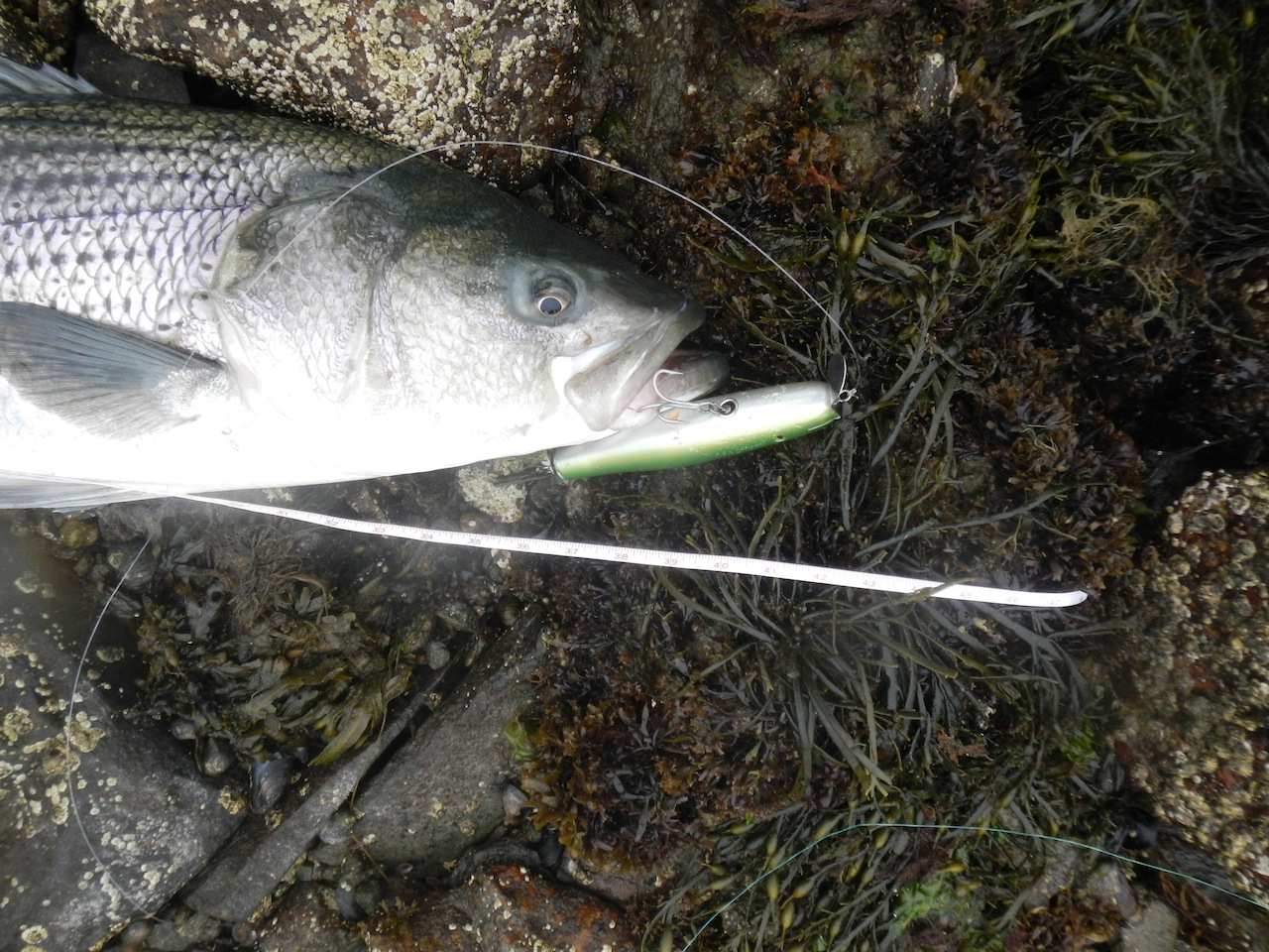 Got this low 20ish fish this morning on a 2.25oz skinny pencil in "great white" color scheme. Pic doesn't do the fish justice, but it went airborne several times during the shallow water battle and was a real pretty fish when it hit the rocks.
