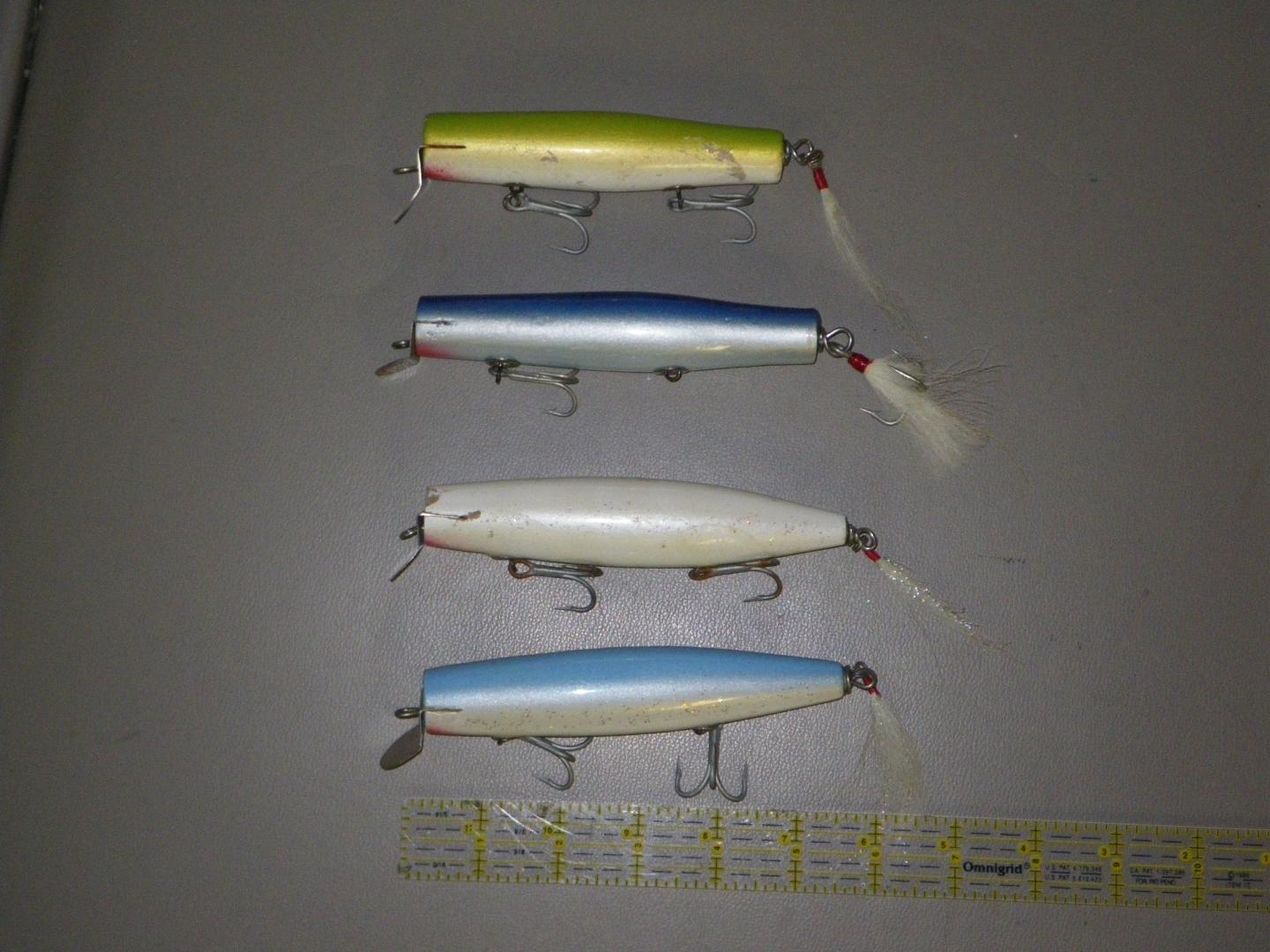 Paul also makes a copy of a little Pichney (the lime green plug in the picture). This stays right on top and fishes great. Recently I came across an original but different version of the Pichney plug Paul copied. It is 1/2 " longer and a smaller lip (the one in the picture is missing its second belly hook). I think I saw a picture of a similar Pichney original that only had one belly hook over on SOL.