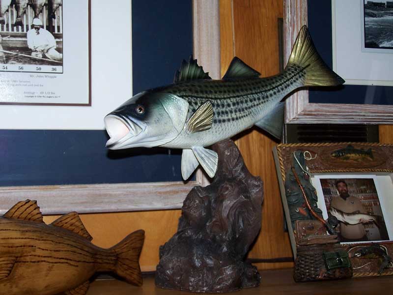 Here is a better picture of the resin bass. He had 2 sizes and this was the smaller one. Not bad for 35 bux. He also had other species; marlin,tarpon,tuna. Large ones are about 3 times the size so I chose the smallewr of the 2.