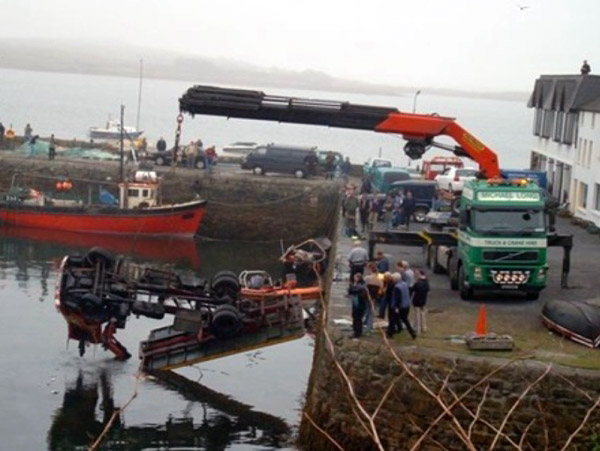 The first one is real,because he didnt use any outriggers at all and he miscalculated the weight of the minivan WITH water inside. the 2nd and third are photoshopped ,look closely and you can see the size and distance doesnt match.