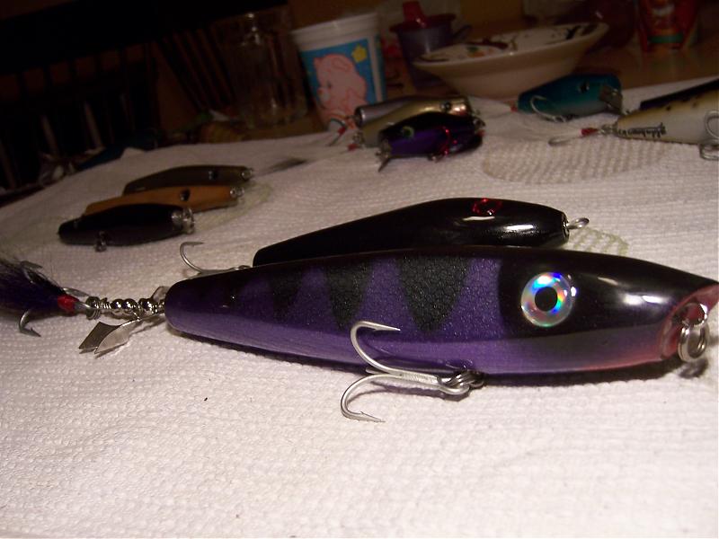 These are going to a show in Minnesota. The big one is 8 1/2" of wood with a couple of chopper props on the end. The nose is cupped out. Throws a good splash up front and churns like crazy from the a$$ end. Sits tails down, sharp twiches with the rod tip can make it slash left then right.