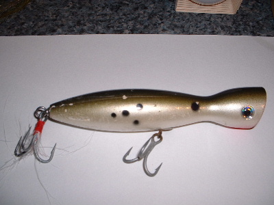 got this off the raffle table at tctffn, this is a excellent popper, cast long distance and works very well  got blues to 12 pounds and bass thursday in soco r.i.....its held up very well...heres some pics of hows the finish and paint looks after