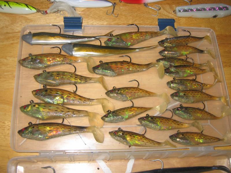 Sluggos (1), Eel, White and Alewife, Lunker City weighted hooks attached