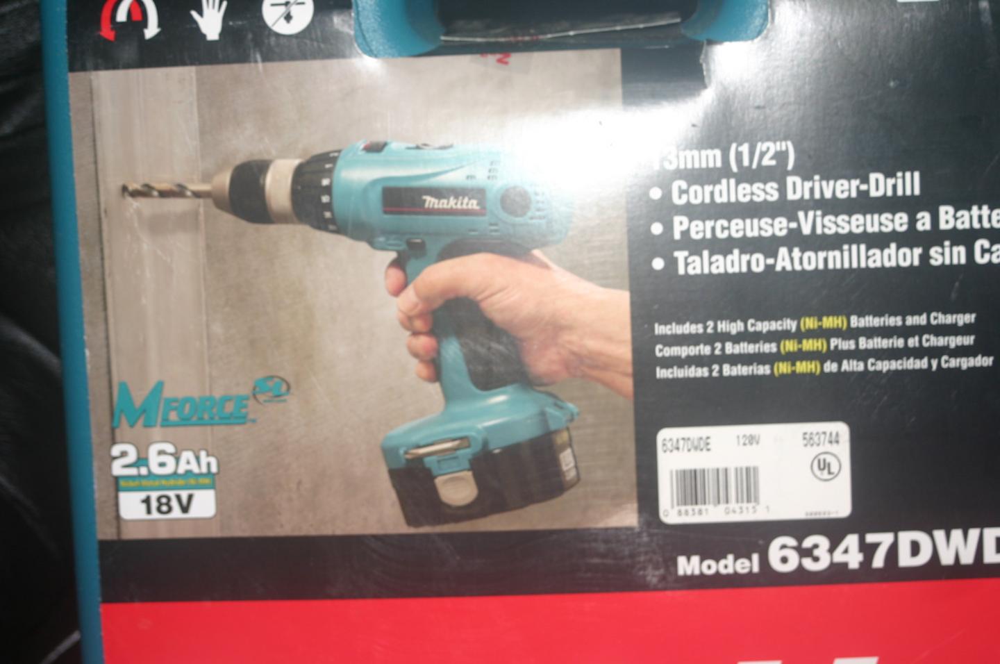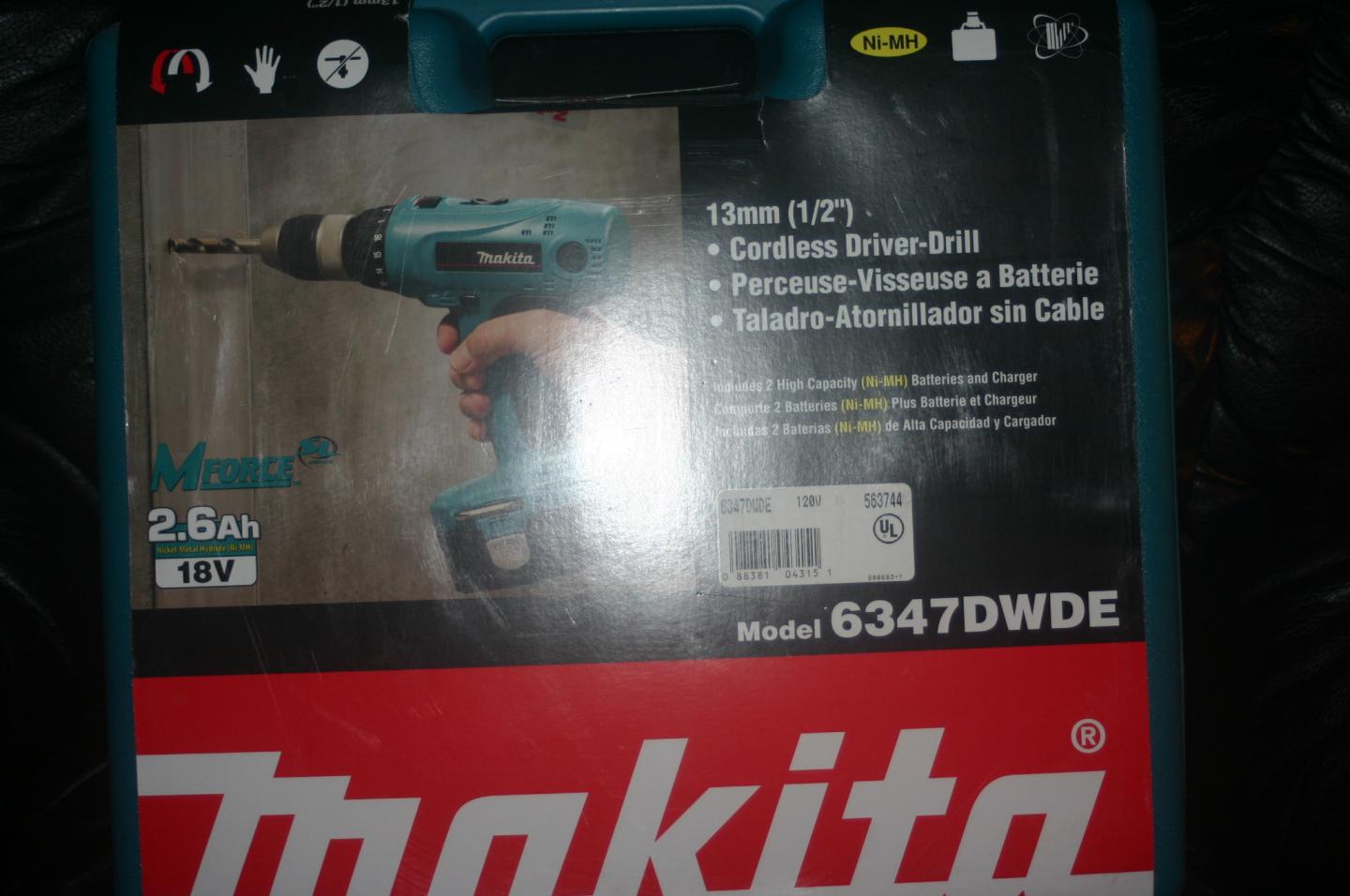 18v Makita1/2" cordless model #6347dwde. New, NEVER used, still in cardboard wrapper. Includes drill, charger and two batteries. (case too)