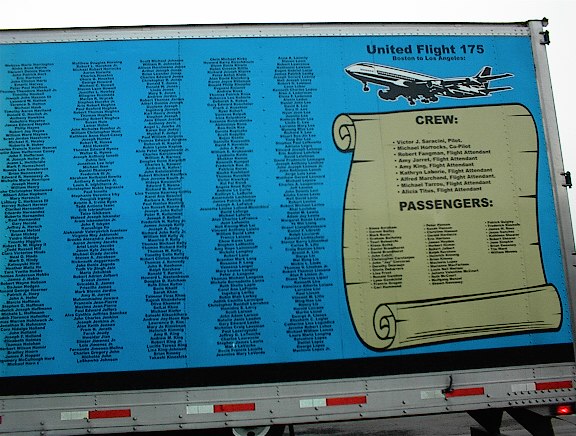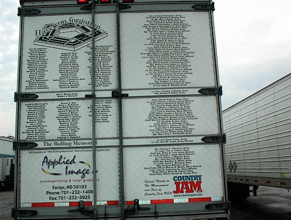 The Rolling 9-11 Memorial, it has all the names of the people that were killed on that day and the flights they were on plus some other graphics on the side of the Tractor.