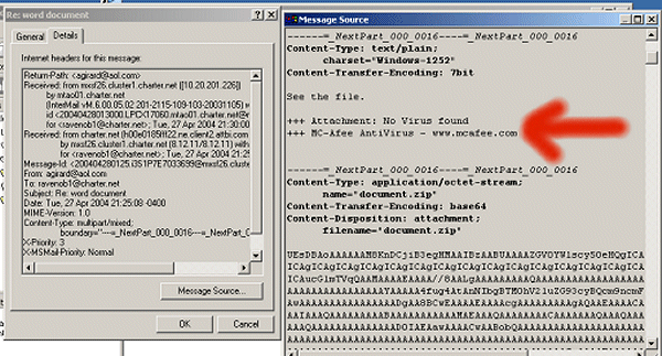 NOTICE that when you right click a suspicious email and then hit properties and then message source you can scroll down and see whats attached without having opened it ... and here in this "illustration "you'll notice at red arrow that it says it was scanned for viruses by mcaffee which is all bull#^^^^& !!