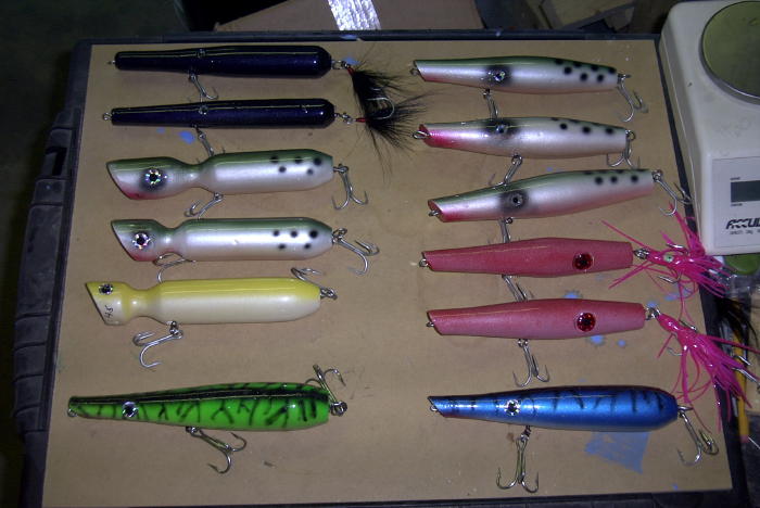 I meant my other left  Shape wise, I think the bottom two will work best as pencils (I could be wrong though). You usually want pencils tapered so that close to the tail is the widest part. Helps keep the weight towards the tail end. This in turn helps them thrash about like you want from a pencil. Not that you can't get other plugs to thrash like a pencil (I'll work a popper that way sometimes), but if the weight is pulled forward some, it takes more work to get them to trash about. The weight in the tail helps keep them anchored and provides a center point for the pendulum. I.e., allows it to rock back and forth with less effort. It also helps with casting. My 2 cents  Try them and see what works best for you.