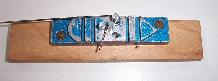 This is very simple to make and your loops will come out perfect every time and they can be made in about 20 -30 seconds each. Pic 01 shows the jig, all you need are the three holes that have the pins in them and one saw kerf with a handsaw. Take a piece of 3/4" hardwood and cut it so it's 1" wide. You can scew it to a workbench or clamp it in a vice which is what I do. The pins are pieces if 1/4" steel rod 1" long. The holes are two in a straight line and the end one at a 45 degree angle up. The holes have 1/16" between the edges so if you do the math, 5/16" between centers when you mark out the holes.Make the holes 1/2" deep. Next to the holes make a saw kerf that your wire will fit into so you can make the initial 90 degree bend nice and neat. Lay the wire the full width of the wood so you'll have an inch of wire before the bend. Now just follow the pictures, in the last picture I tighten up the loop by squeezing the ends together with a pair of pliers. ...mrpogie