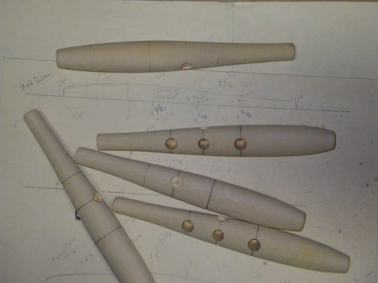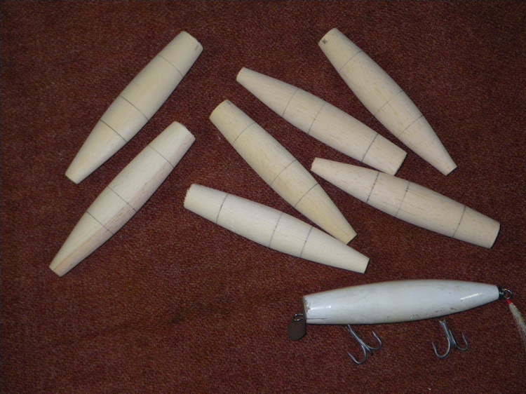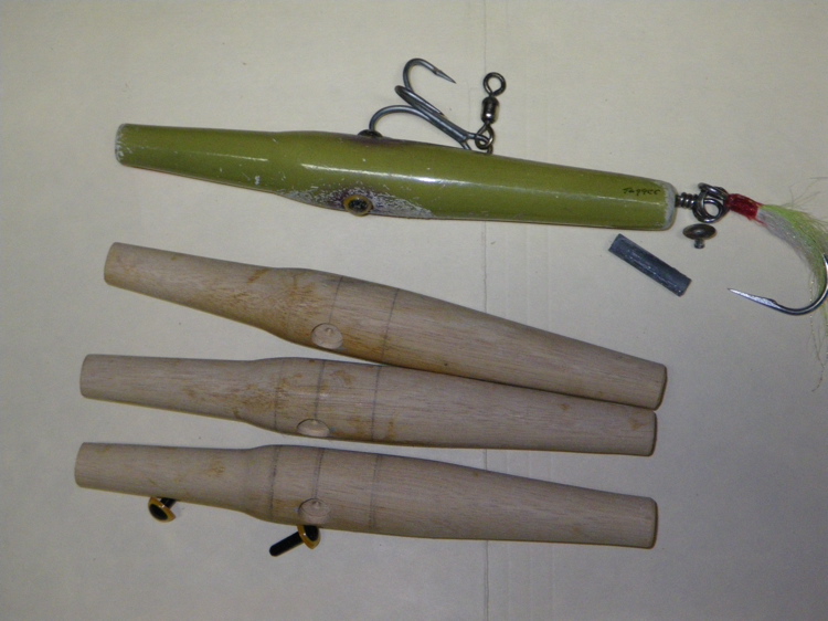 First a few WY Poppers. Frech claimed this (and an A40) where his most productive plugs. Supposedly he used them at night. Birch and heavy. He is vague on how to weight them. The diagram shows two huge 1/2" by 5/8" weights (which yields a 4 oz plug), his article talks about casting 1/2 by 3/8 weights for the plug (3 oz end result). I did both but think the lighter one is right.