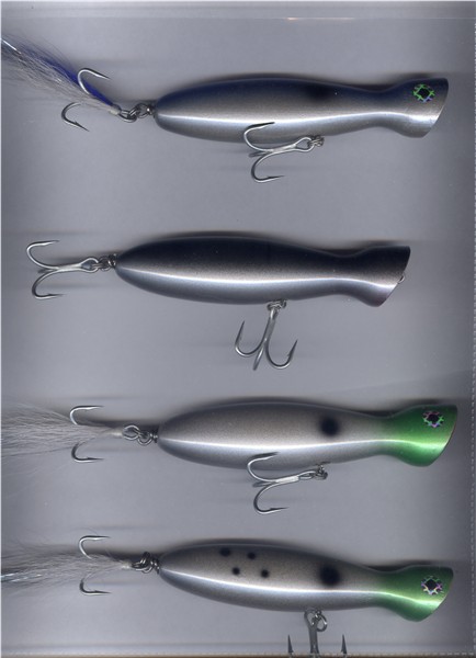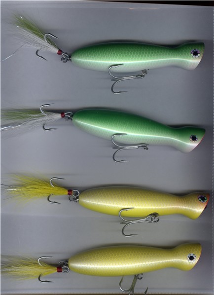 Those are the best looking poppers I have ever seen! Your killin me over here  The color and pattern choices are PRIMO! Excellant job on the tails as well. I need all the specifics though. Whats the weight? What are they made out of? How did you get the faces cupped so perfect? What clear finish are you using?