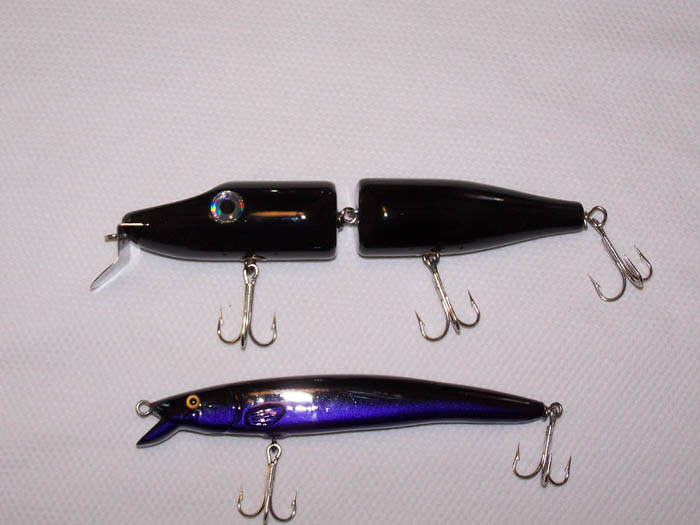 One of these was destined for plugfest but a couple of small flaws make them stay in my bag. I'll have to submit something else. The jointed pike is 8 1/2" plug the lip and weighs 4 1/4 ozs. It has a nice wiggle . The bomber has epoxy molded fins, gill plates and lip.