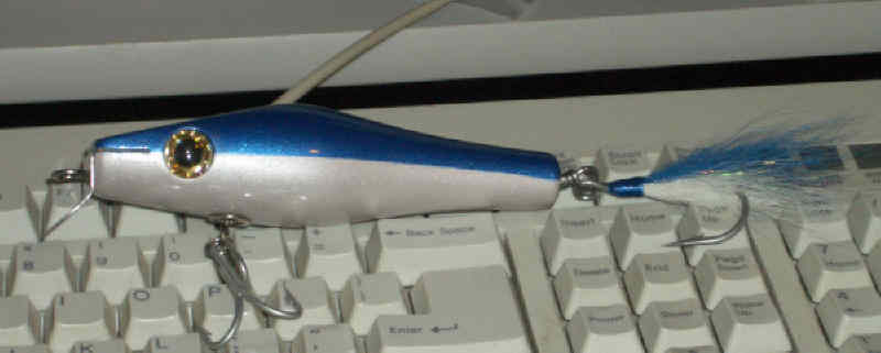 Anyway, all day, I was eying this plug on the raffle table, and low and behold I won it. Who made it? Nobody seemed to know. Do You? I would really like to know who to thank when I catch my first large of the season on this bad boy. Help me out