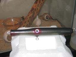 The plug color is dark dark grey with some kind of chameleon belly like gold. He used a big honkin' spro swivel and did a nice job on the wire wraps. The epoxy looks like envirotex but it has a small ruff spot above the nose area. I think this plug body was made with the plastic trim board stuff so it will be indestructable.