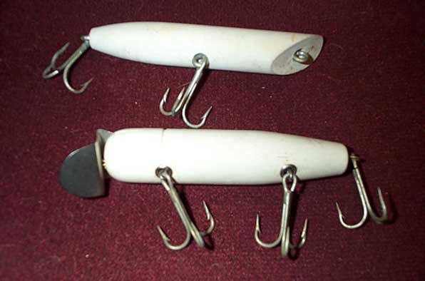 Peter, Stan Kuzia, maker of the Ku-jigs and Ku-kig eelskin rigs made a few plugs that he sold along the canal in the 60 and 70's. Not very many but a few. This may be a couple. He was heavily influenced by Gibbs ( Stan K, Stan G, Arnold Laine and a few others fished together) he could get parts from Gibbs as well. The lip looks like an old style GTS lip and the hardware looks the same as well as is the placement of the screw eyes on the popper along with the countersink. Stan K loved eelskins. He was at the show Sunday. I was talking with him for an hour or so and he told me he is making plugs again and he was making me one that I could "cast across the canal with", Maybe Big Dave can but I assure you I would be happy with reaching the middle. Satn is 82 and still fishes almost everyday in season. He just mastered the spey rod and can cast 150 feet plus. I think that they might be of his making. Not positive though.