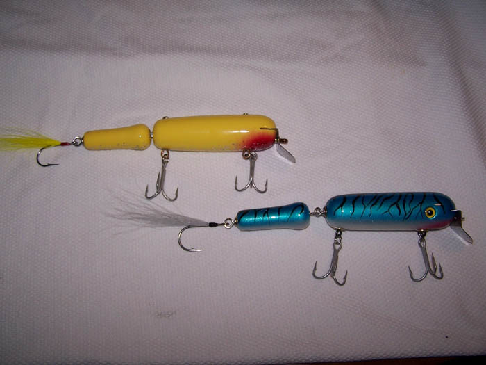 Yellow one is done old style; cotter pins and sliding weight. Mackeral one is more modern day. epoxied weights and thru-wired