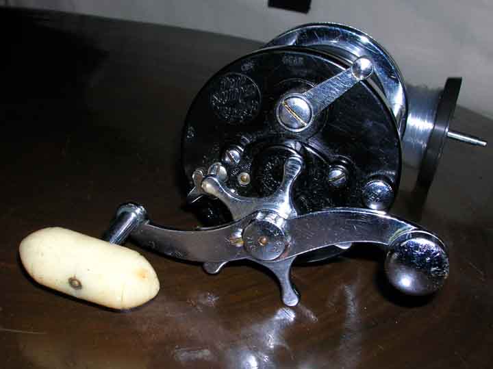 Aluminum spool. Left plate is red and has 2 magnet cups and 2 quarter-inch rare earth mags. Right plate is black. Pearl bakelite handle is cracked (replacement costs $8). New HT-100s, extra aluminum spool . Minor boat rash. Fresh 40# Ande mono on both spools. $45 shipped to your door.
