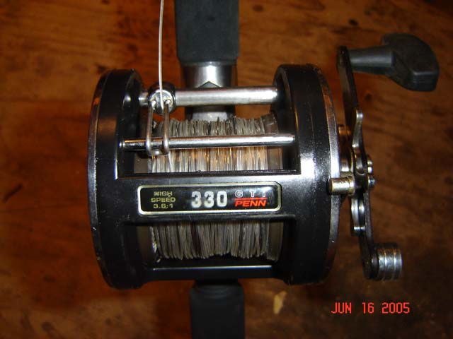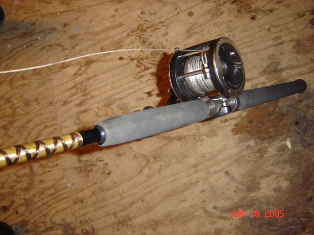 Custom wrapped 7' blank with carbaloy guides, eva grips and gimble with a Penn 330 GTI reel loaded with 350 yards of wire line. The line is separated in sections of 100-100-50-50-50. Setup is a little over a year old and used about 6 times. $175 Will not ship but will meet at reasonable distance.