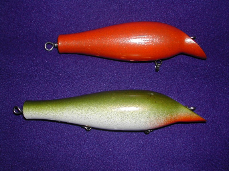 Did two of those Nike Roman style plugs. Big one is 6 3/4" long with .4 ounces on lead in the butt, nothing in the belly. The little one is 5 1/2" long with .2 ounces of lead in the butt and a 00 buckshot in the belly. Both turned with cyprus. We'll see how they swim after the epoxy sets up :-) Very interesting plug to do.