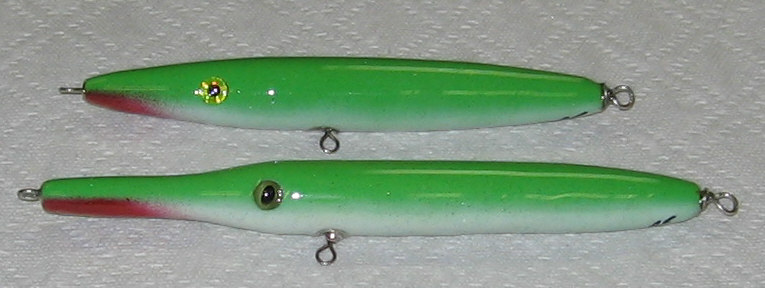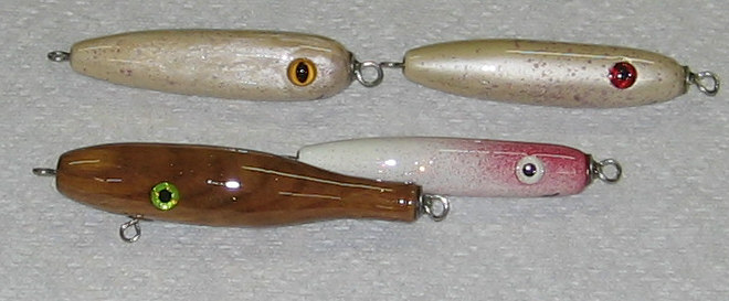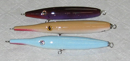 Cedar Darta weighs 2-1/2 oz. dives deep and wobbles, but doesn't flip. I think its a keeper. Also making some heavier ones now out of some hard old yellow pine and a few Basswood Surfsters that were sealed today. Will start paining when I get back from vacation in about a week.