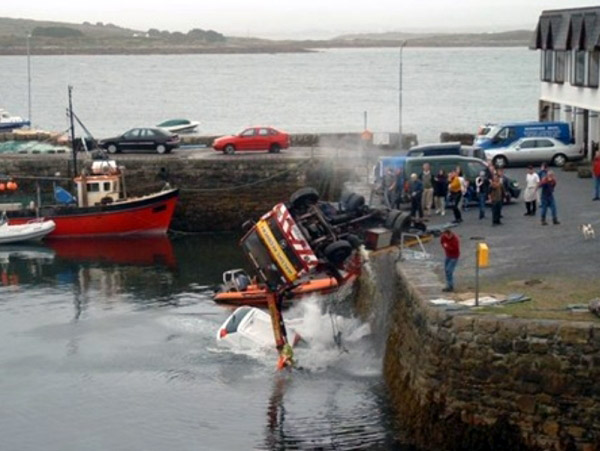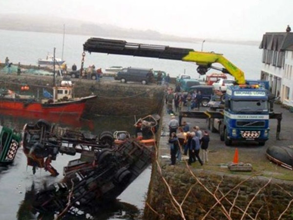 The first one is real,because he didnt use any outriggers at all and he miscalculated the weight of the minivan WITH water inside. the 2nd and third are photoshopped ,look closely and you can see the size and distance doesnt match.