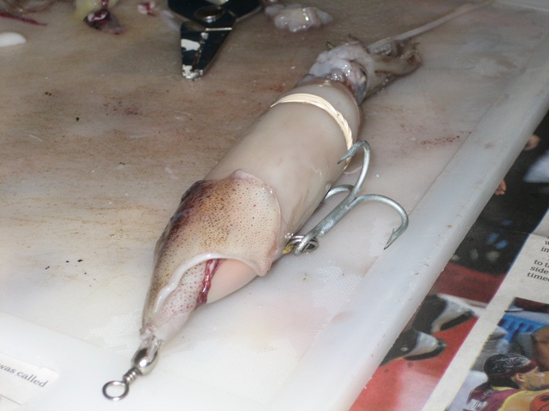 That looks great! I fished whole squid last year. Caught fish but always lost the tentacles. I had the same idea but hadn't yet attempted it. What did you use in the center? How did the you attach the squid to it? I see the rubber band, but I dont see one on the tentacles. Thanks.....I can't wait to get started.