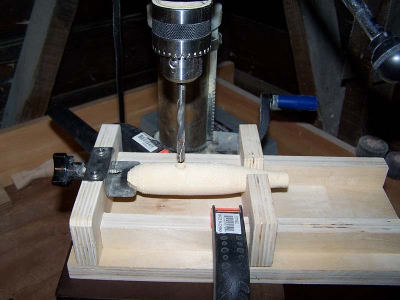 Here are a few different jigs I use to make life easier. first is the V block for drilling belly holes. Just center the block under your bit, set the depth (so you don't drill through). It is easier if it is thru drilled first as you can feel the drill bit when it hits the thru wire hole.
