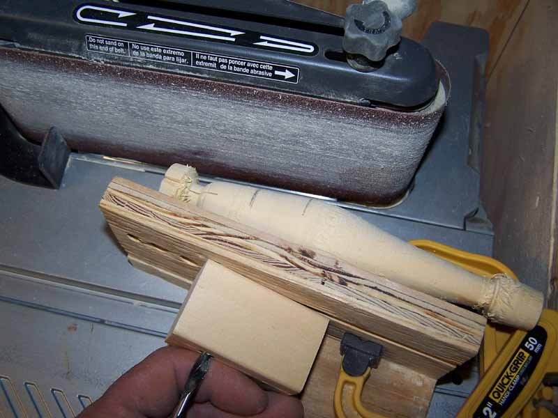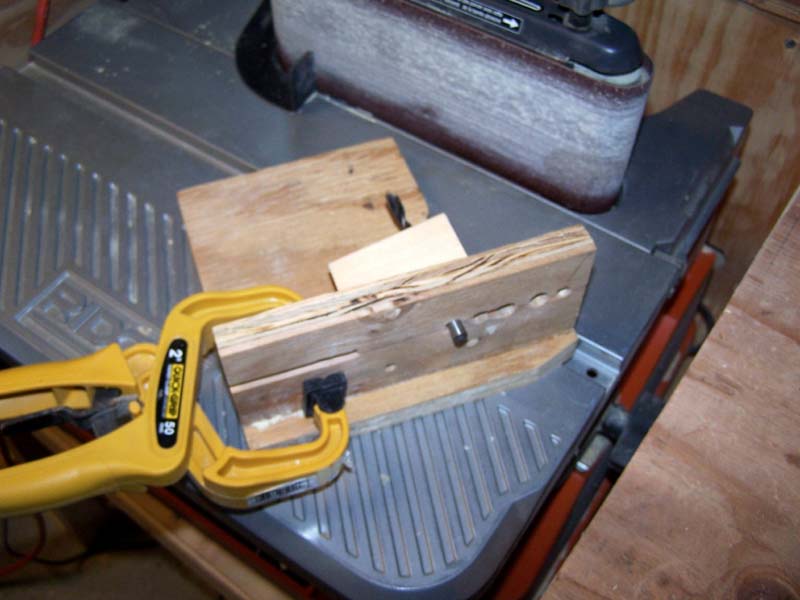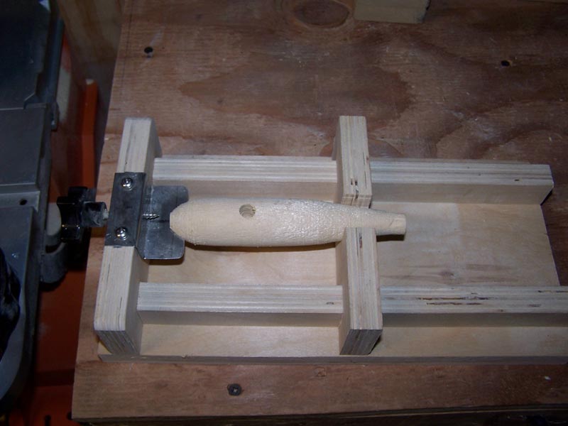 Third is a jig I use to cut head slopes on surfsters or pikes. Note I set my sander table at a similar height to my bench. you could use a dowel but I use the same size drill bit as I used for the belly hole. The vise grip clamp holds the tail even with centerline.