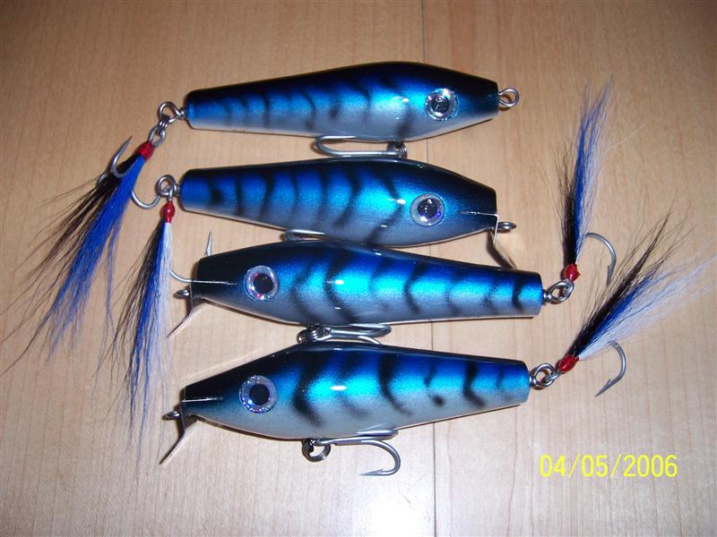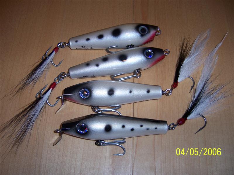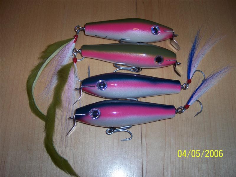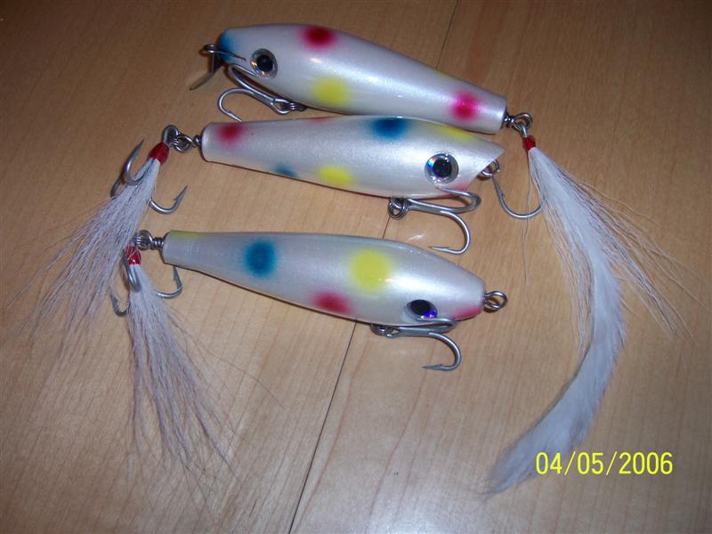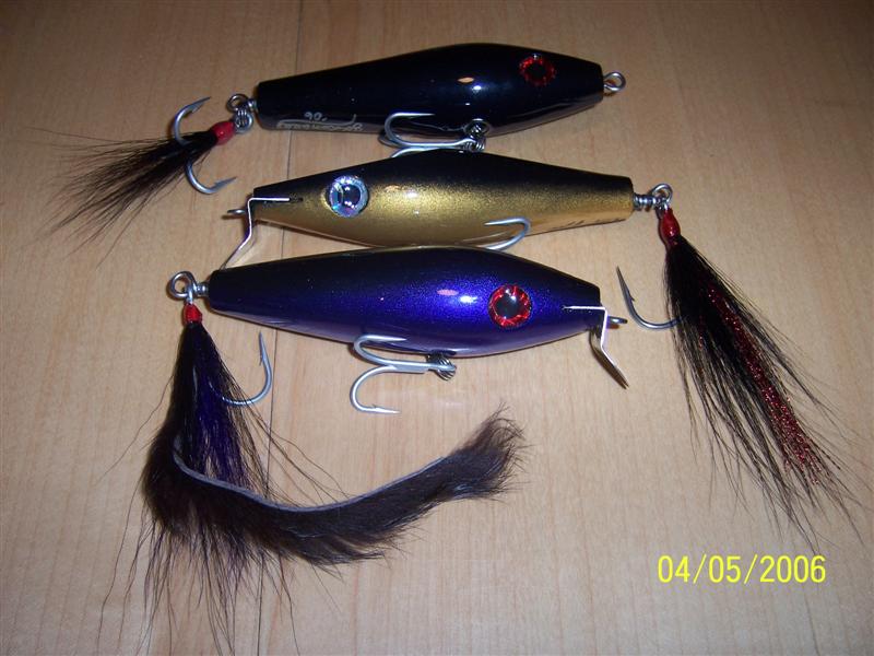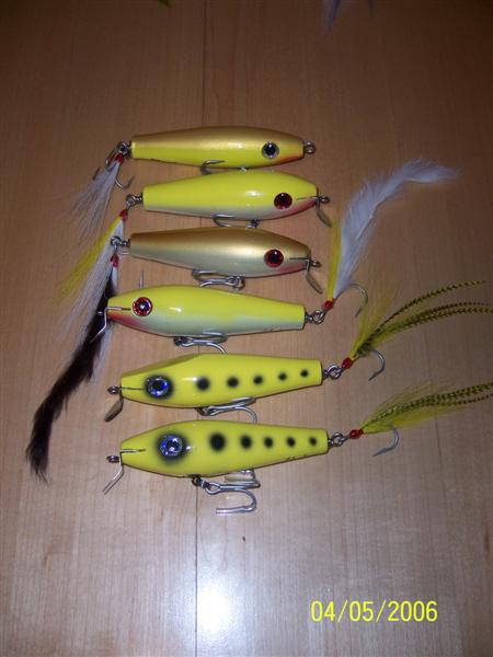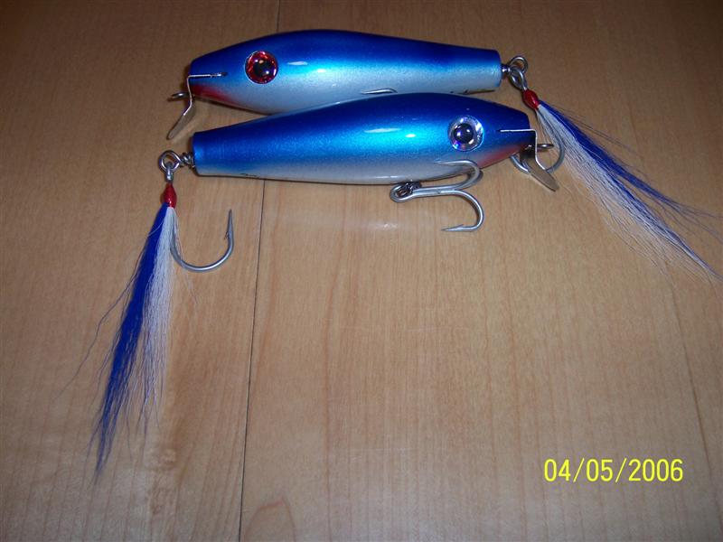 The swimmers leave a large v wake when reeled real slow and drop down a foot or so when pulled faster. I amsurprised at how much water the poppers threw, even with such a small mouth. I was just playing around when I cut the nose off, but it seems to work. Now I'l see how the fish like them.
