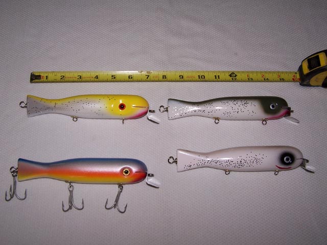 These were inspired by a thread TomD did on another site. They weigh 3 ozs and swim with the tip of the tail sticking out of the water and wagging lazily back and forth. The eyes are glass and came from Van Dyke.