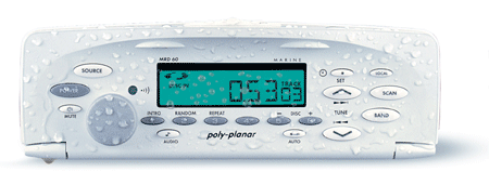 The Poly-Planar MRD 60 stereo system is the first sound system specifically designed for the Marine Industry. It is the most versatile, feature-rich system in the marine market. The front panel of the stereo is waterproof and does not require an additional cover when mounting the system above deck. The front panel folds down for easy CD loading, and then, when closed, a silicon rubber gasket keeps the unit tightly sealed. A bright electro-luminescent LCD display is easily visible both at night and in direct sunlight.