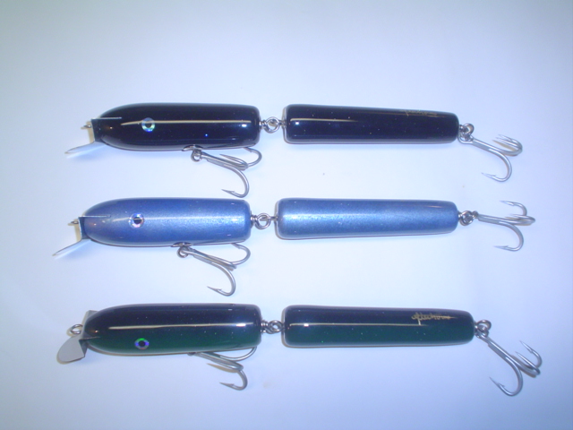 Actually, I don't fret too much about the number of hooks on a plug. As Finadict points out, big fish usually inhale the thing. Rather, I'm more interested in the way the plug floats. Jointed plugs usually float with the tail hanging down, and swim with the head down, which brings it through the water in bent back shape (at least at slow retrieve speeds). Works fine, just think of a jointed bomber. By chance, however, years ago I built a jointed swimmer that seems to be a real "magic" plug" for me............one that consistently catches fish, even when things are slow. I've had trouble reduplicating it. Two things I've noticed about it are that it swims more level than the others I've built, and it's bouyancy is very close to neutral (its made out of maple), which lets it suspend when I pause my retrieve. I also like long hackles on the tail of this type plug. They act like a third jointed section and give the plugs a seductive sinuous action.