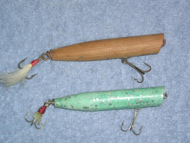 Here are two similarly shaped plugs. The green one is obviously an Atom. Besides the makeup of it, I am sure because I have the old display card it came on. They used to come on a large cardboard display not individually packaged. I found the wood one back in the mid 80's when I was in my teens. It belonged to my grandfather. I and some other people I knew thought it was also an old atom. I showed it to Bob Pond around 1986 or 87 and he told me that it wasn't one of his from the "old days". So I thought I would revisit the topic about 20 years later. Anyone have any ideas?