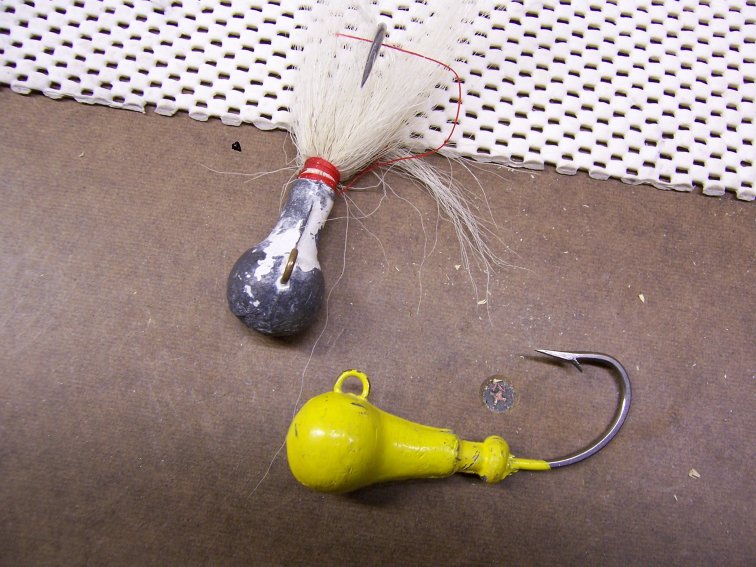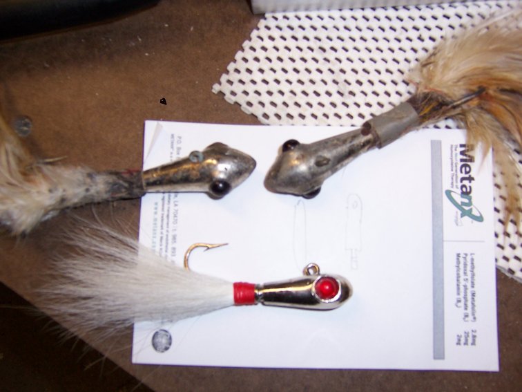 I have a couple of the jigs in discussion in my photos and figured if I attached them it would clear up any questions about the jigs. These are the newer versions of the jig and they hold up pretty good. They are available in all weights. Depending on the speed of the current, I use a pork rind with them. Sometimes a curly tail is good also. The only trouble with the rind or curly tail is that it takes a little longer to get the bounce needed.