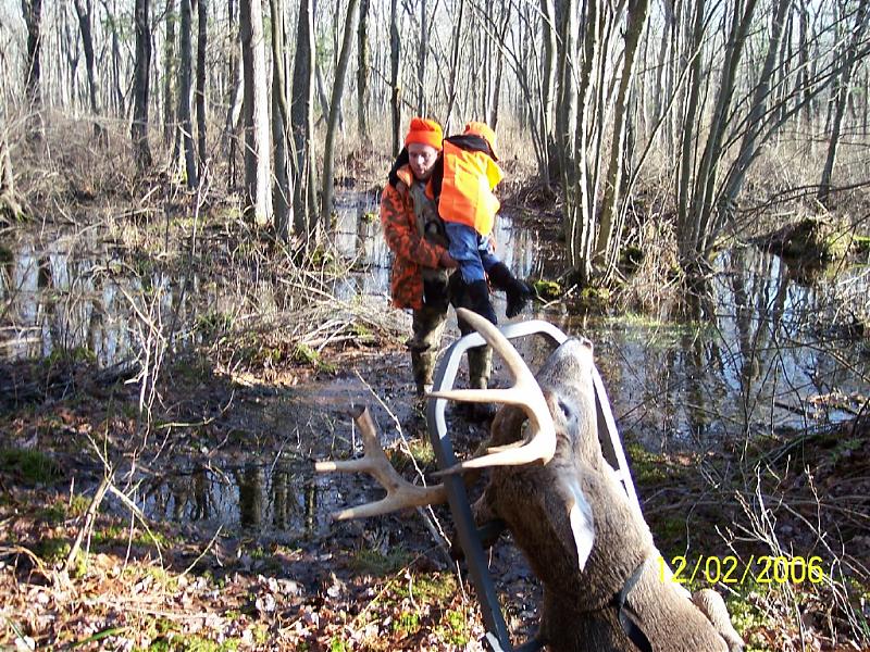 So after I see him go down about 100yrds away.. I finaly calmed down made my way down the tree and headed home to get my son Philip,, before even taking a look at the buck. Still in his jammies eating cereal.. I told him I had shot a deer and needed his help finding him. There where some areas in the swamp that where deep and very briery but he was haveing a blast. As we got to the area where I had shot him, I put Philip on the blood trail and told him to start looking, when we got closer my brother taped my shoulder, we could see the buck but Philip still hadn't so we told him to continue while we looked in another direction. It didn't take long he was so excited finding that buck. It was a morning we soon won't forget. I don't know how many times he told me how great of a day he'd had , he also said he'd rather be hunting then playing any day. It was so awsome taking a nice buck but even more so shareing it with my son. Thank you Jesus.