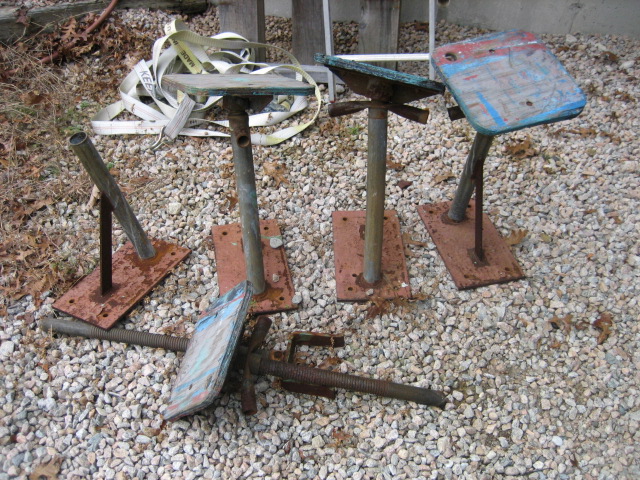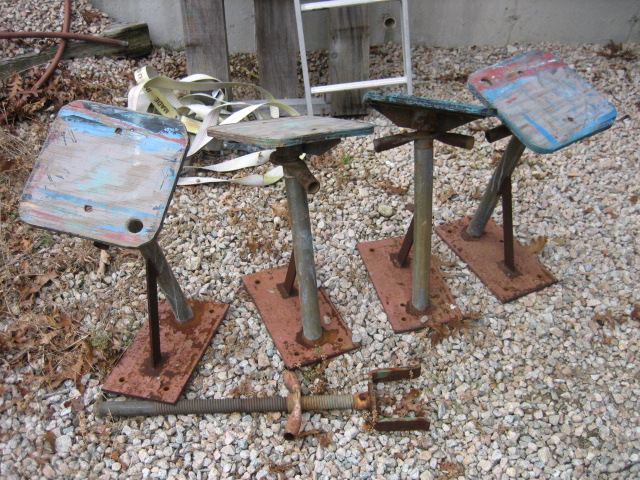 Four stands with screw jacks and pads, plus a fifth that was set up as support for the bow. These were bolted to the deck of a flat bed trailer to haul and store my 19' long by 2' deep sailboat. I'm sure with little effort they could be adapted to use on the ground. The screw jacks come out of the pipe stands. Won't split up. $110 pick-up only SoCo, RI.