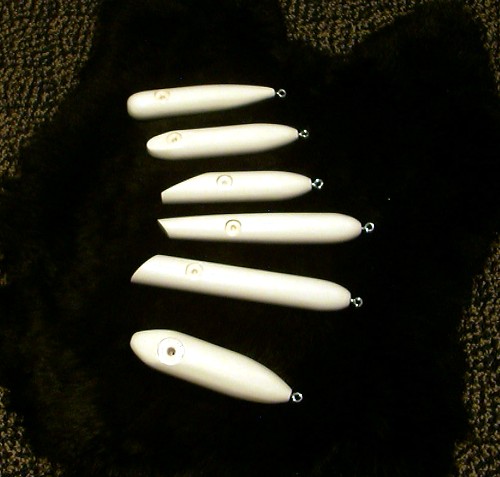 O.K. here they are all primed ready to paint. all are hand carved.cut,eyes drilled out,sanded an primed in white. the TOP 3 are 1"x 5" the bottom 2 are 1" x 7' all are drilled an weighted. the fat one on the bottom is 1"1/4 x 5 as you can See there DOWELLS. as soon as I get them painted an some screw eyes w/ hooks on them Ill post them done an ready to fish for next season. got some BIG BOYS ready to prime up also BUT need bigger screw eyes. will have to weight till I get them to PAINT. well that it just some playing around w plugs. got to get back to TYING show are up an comming. need NEW stuff. enjoy. COMMENTS WELCOMED. GOOD,BAD,or INDIFFERENT.
