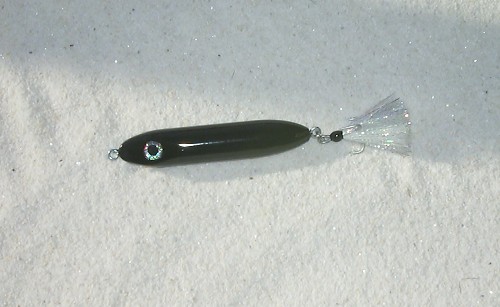 PLUG NO.3 hot of the rack ! I kind of like this one best. as you can see it's 5"long 1.1/4 wide,used a 3/4 molded eye. they say the EYES ATTRACT. this guy should get some attention. FAT BOY. weight is 2oz