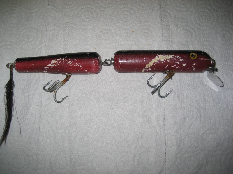Assemble the plug, leave the joint loose enough so the tail can swing 90 degrees, it will cast better that way. When you float it, it should float with the back just barely ou of the water, and the head just barely submerged. Use a long hackle and no hook on the tail. I use 3/0 on the belly. This is what you get. Try making one, I think you'll be pleased.