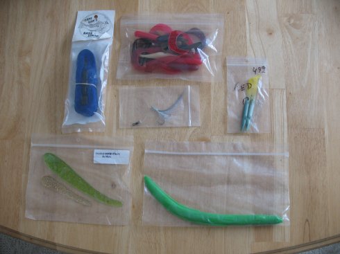 Cape Same Bass Strip, 2 red gills, Bill and Juls teaser, 2 Mario squid Strips, A. Eel and bag of 5" grubs, $10 plus shipping.