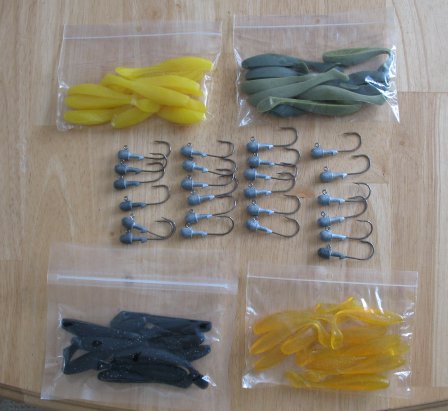 Schoolie shore kit, 4 bags of 3-1/2" Ledge Runner shad bodies, with 24 of the 3/8 oz Kalin Ulimate Jig Heads, grab a light rod and in a month you can have some fun. Greatly reduced so some fun can be had at $22 for the lot and you pay shipping.