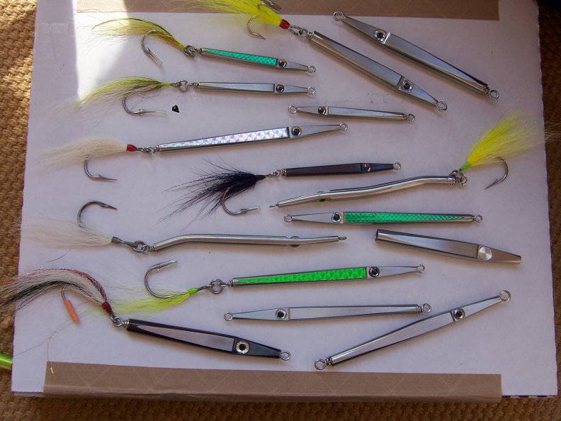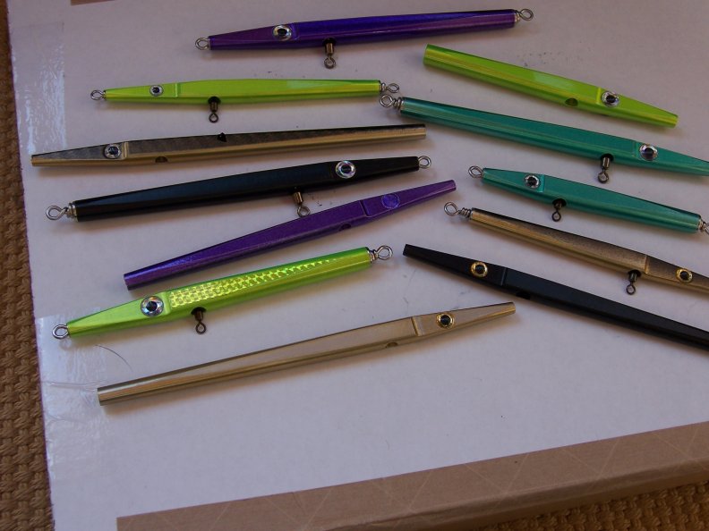 Steve you have seen all the crap I got. Some stainless. Some aluminum which is powdercoated which didn't stand up to the elements, although the black ones are hard coat anodized and will stand up but the cost is high. That is why I gravitated to the 316 stainless, no corrosion but no pretty colors. All thru wired. Some are weighted some not. Some light and some very heavy. Small for the schoolies and funny fish. Time consuming to make so I have not done any in a while. I plan to try a jointed one sometime in the future. I have some ideas. I have only got small fish on them, but some have them and I hope they produce a small tuna or 2.
