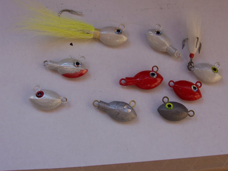 Also done some molds, here is the best one i made IMO. 2 oz. Peanut thingy. Have not done much with this mold lately. Just gathering dust down stairs. These would be good for fall peanut run and for fluke I would think, but I fish sand eels so never tried them. It is a double mold so i modified one of the jigs so you could tie the hair directly on the lead instead of the hook. They are swing hook. Some don't like the swing but I do. I am going to give these more of a go this year. P.