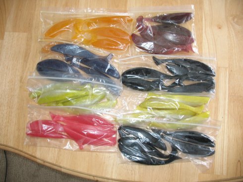 Big 6" shads, in plum, black, yellow-pearl and root beer, normally these are $6.50 and $7.50 for single and laminated colors. I'm lettting the lot of 8 bags of 5 counts go for $30 and you pay shipping.