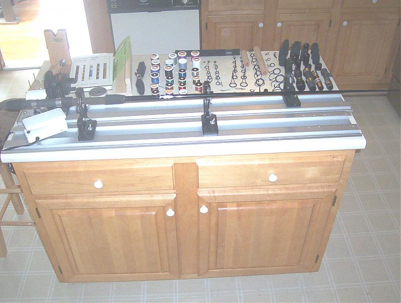 (Truly for the serious rod builder. Self centering chuck, multi spool thread carriage with tension device, ceramic line guide blade, 3 fully adjustable rod stands with ball bearing wheels, foot and dial controlled wrapping motor (can also turn cork grips), 45" indications on flywheel for diamond wraps, sectional 8' anodized aluminum base, 4000 rpm wrap motor, 11 RPM finish/dry motor.)