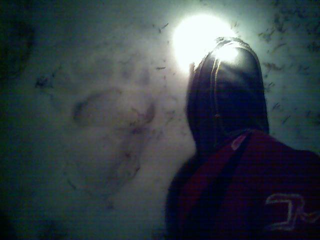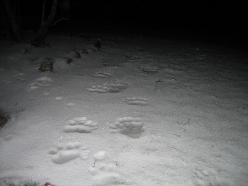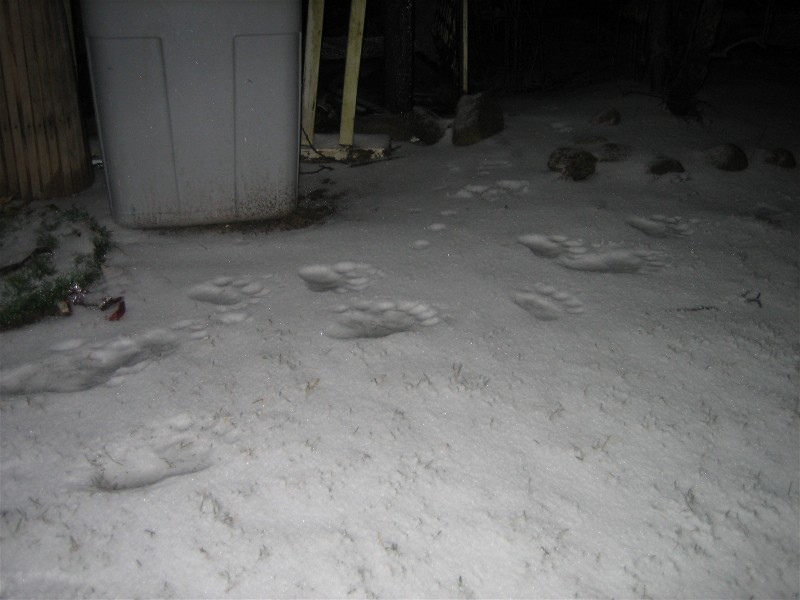 There is two sets of prints. One went one way around the house and the other the other way. One sat under the birdfeeder and ate the seed. Crazy thing is the larger one put one paw on the front step. One of our cats just sat on the porch and watched. I have a cell phone pic I will try and send.