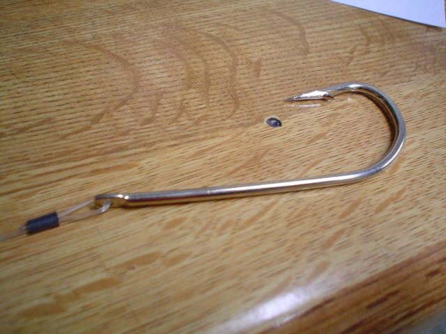 buy one off ebay and smash it with a hammer ... My Big Daves ... Similar I use wire thru the hook and crimp a sleeve on .. run wire thru the plug and out nose 10" and crimp a sleeve on making a loop .. Secure hook in arse with molten lead..Hi Dave ..