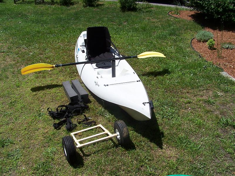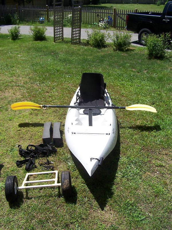 I have had this kayak for a few years now and just don't have the time to use it. Having a 3 year old son running around just takes up a lot of my free time! Its in good shape. This is a sit on top model. Comes with a tall seat with 2 built in rod holders, paddle and foam cushion roof carrying system. When I bought it... it came with a 2 wheel cart... I guess to wheel it from your car to the water. I never used it... but it is included as well. Has scupper holes and air tight storage under the deck. Also comes with a Ram rod holder positioned between your feet. Measures 12'6" stem to stern. It is located in East Falmouth. Come down and try it out.... wet a line while you are here. I'll attempt to post pictures....